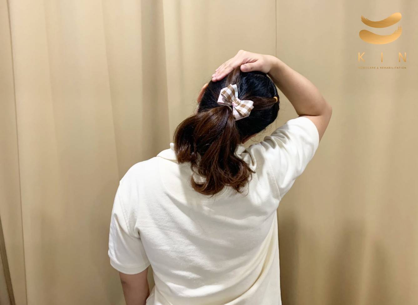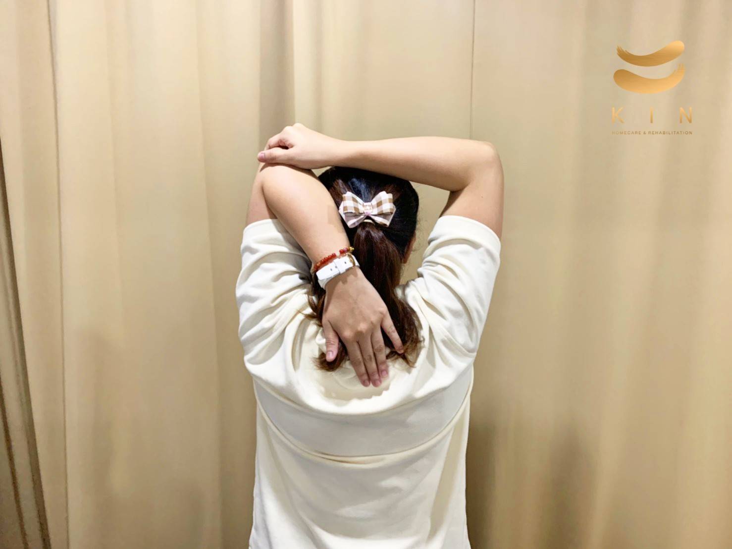 ท่าแรก มือข้างหนึ่งยกขึ้นและจับบริเวณหัวไหล่ มืออีกข้างหนึ่งจับข้อศอกของฝั่งตรงข้ามตามรูป ทำสลับกันแต่ละข้าง ค้างไว้ 5 วินาที