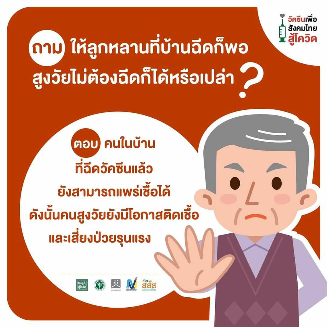 ตอบ คนในบ้านที่ฉีดวัคซีนแล้วยังสามารถแพร่เชื้อได้ ดังนั้นคนสูงวัยยังมีโอกาสติดเชื้อ และเสี่ยงป่วยรุนแรง