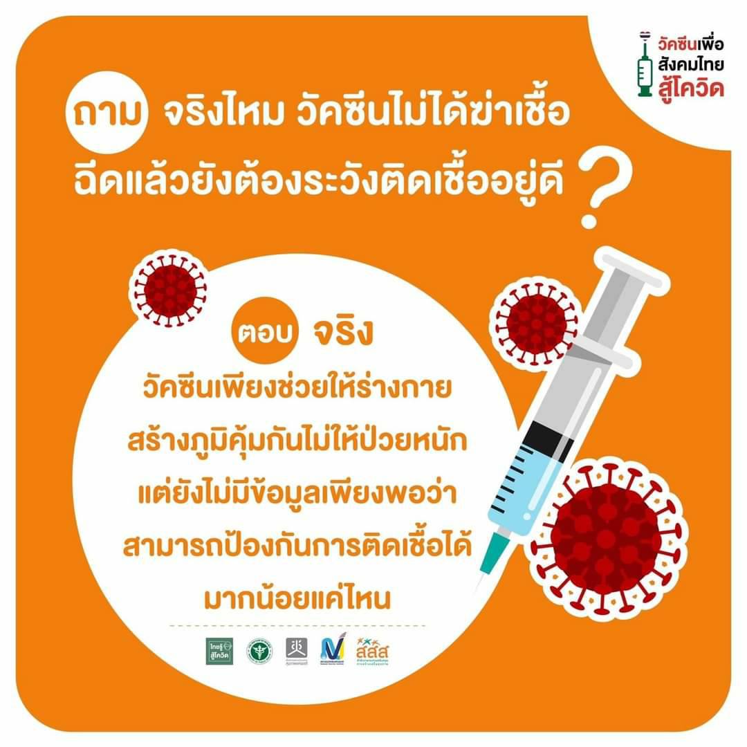 ตอบ จริง วัคซีนเพียงช่วยให้ร่างกาย สร้างภูมิคุ้มกันไม่ให้ป่วยหนัก แต่ยังไม่มีข้อมูลเพียงพอว่า สามารถป้องกันการติดเชื้อ