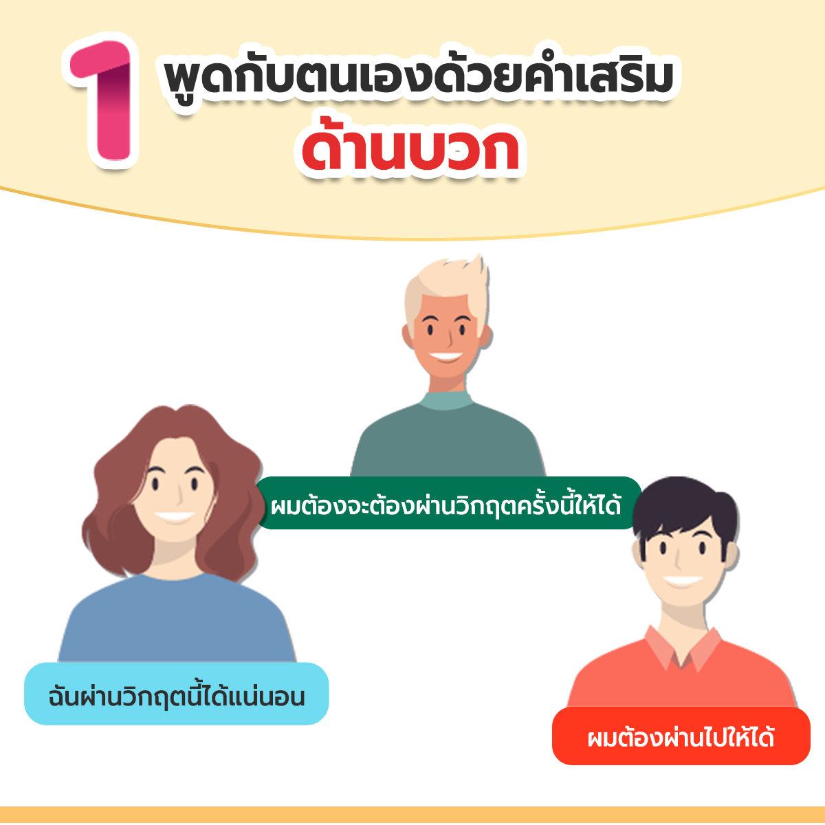 1. พูดกับตนเองด้วยคำเสริมด้านบวก “ฉันต้องผ่านไปให้ได้” “ฉันจะต้องผ่านวิกฤตครั้งนี้ให้ได้” “ฉันผ่านวิกฤตนี้ได้แน่นอน”