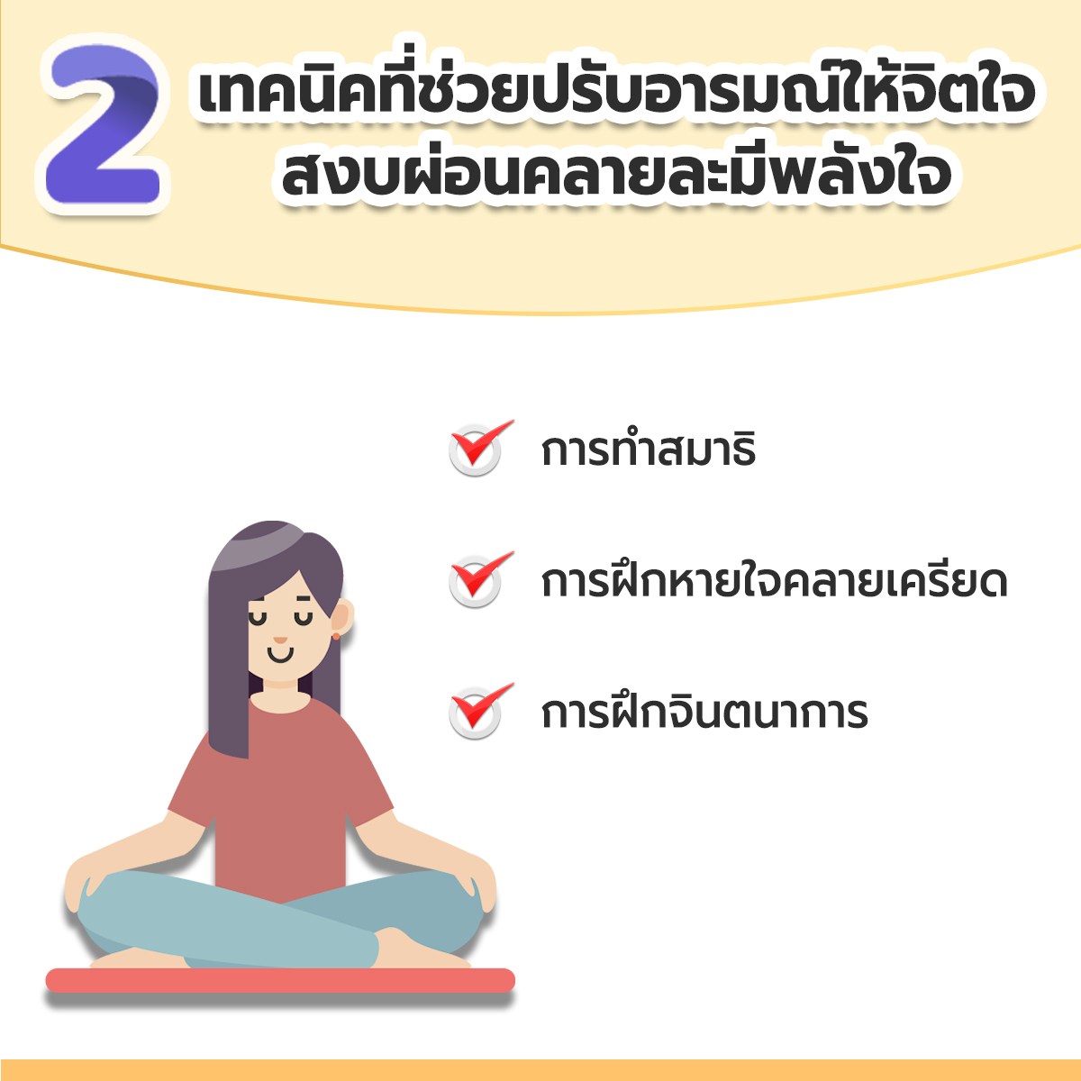 2. เทคนิคที่สามารถช่วยปรับอารมณ์ ให้จิตใจสงบผ่อนคลาย และมีพลังใจในภาวะที่เผชิญความลำบาก ความทุกข์ ความเครียดได้ดี
