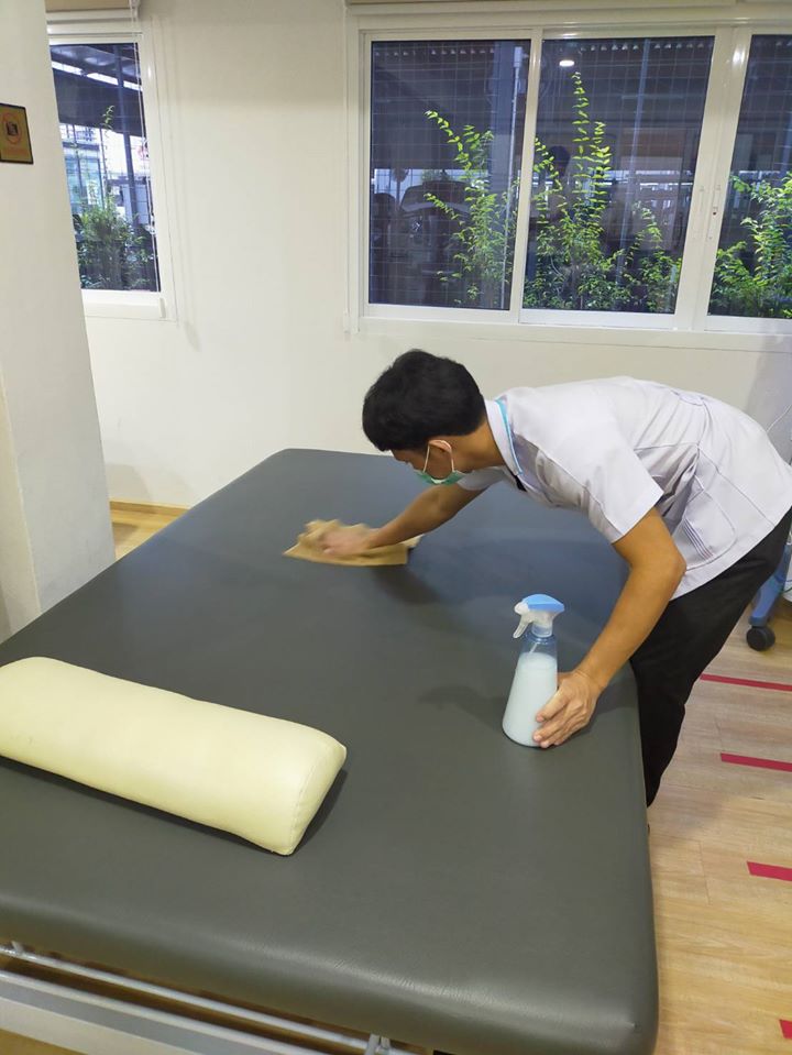 → เดิมทางคลินิคกายภาพจะทำความสะอาดอุปกรณ์ที่ใช้กับผู้เข้ารับบริการ เช่น เตียงนอน ไม้เท้า ด้วยน้ำยาฆ่าเชื้อหลังกายภาพบำบัดในแต่ละรายทุกครั้ง หลังการแพร่ระบาดมีการทำความสิ่งแวดล้อม เช่น ประตู โต๊ะ เป็นต้นและทำความสะอาดถี่มากยิ่งขึ้น