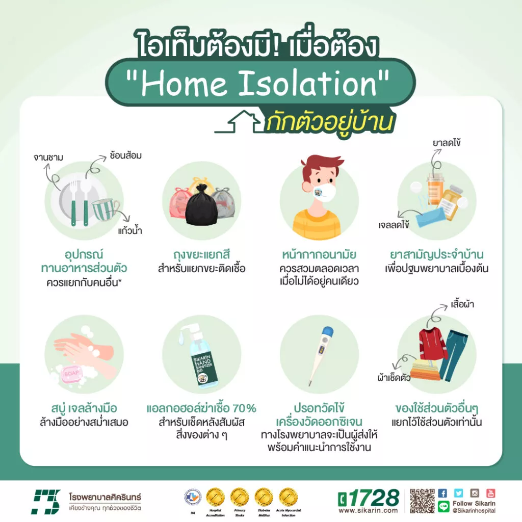 หากป่วยเป็นโควิด-19 แล้วต้องกักตัวที่บ้านหรือ “Home Isolation” สิ่งของจำเป็นและแนะนำให้มีเตรียมไว้ มีดังต่อไปนี้